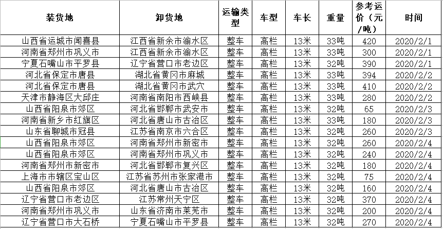 目前受疫情影響,各地運(yùn)輸價(jià)格都出現(xiàn)不同程度上漲現(xiàn)象;銀耐聯(lián)物流板塊根據(jù)實(shí)際情況調(diào)查,結(jié)合各地運(yùn)輸政策以及運(yùn)輸動(dòng)態(tài),匯總部分地區(qū)運(yùn)輸價(jià)格,供諸位耐材企業(yè)物流負(fù)責(zé)人參考。以下為自 2月份以來(lái)部分地區(qū)物流交易參考運(yùn)輸價(jià)格匯總表: